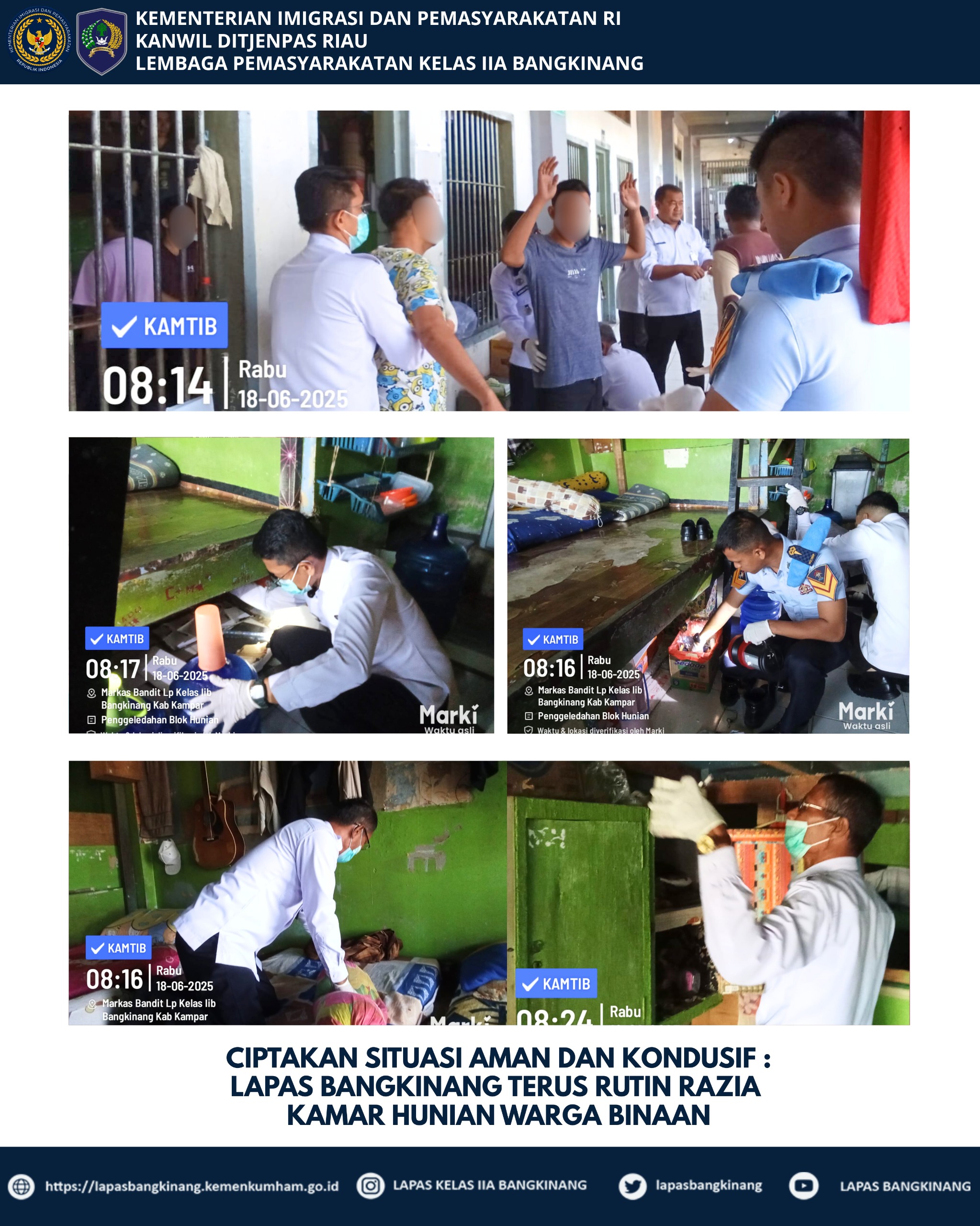 cMczone.com, BANGKINANG– Dalam rangka menindaklanjuti Arahan 13 (tiga belas) Program Akselerasi Menteri Imigrasi dan Pemasyarakatan, Bapak Agus Andrianto khususnya pada poin 1 (satu) yakni Memberantas Peredaran Narkoba dan Pelaku Penipuan dengan berbagai modus di Lapas dan Rutan, Lembaga Pemasyarakatan (Lapas) Kelas IIA Bangkinang Khususnya Tim Satopspatnal kembali ambil tindak cepat lakukan razia di beberapa kamar hunian warga binaan, Rabu (18/06/2025).