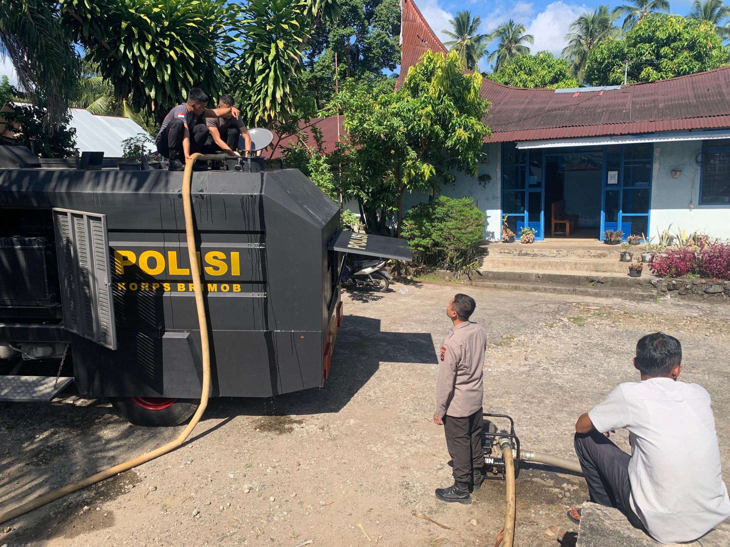 Menindaklanjuti hal tersebut, Polda Sumbar melalui Satuan Brimob Kompi 3 Batalion B Pelopor langsung turun ditengah warga membantu menyalurkan air bersih dengan menggunakan kendaraan Armored Water Canon (AWC), Kamis (10/7).