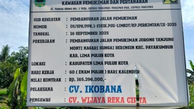 Oleh Dinas Perumahan Rakyat, Kawasan Pemukiman dan Pertanahan Provinsi Sumatera Barat pada 16 September 2025. Pekerjaan yang direncanakan selesai dalam 60 hari kalender ditangani oleh CV. Ikobana dengan pengawasan dari CV. Wijaya Reka Cipta.